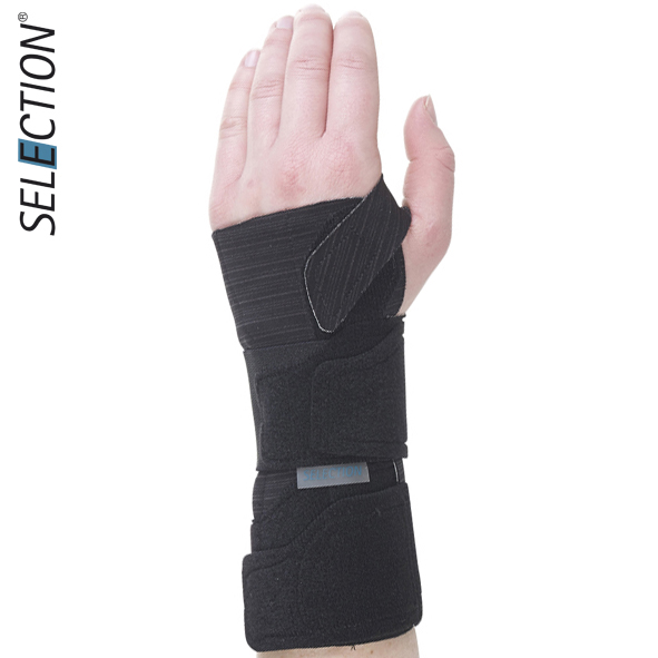 Selection Open Wrist is a brace that is simple to don and doff. It can be open totally flat. The integrated "wrap around" straps gives increased stability around the wrist. It has an adjustable thumb strap. The shape is cut out in the palm area which allows the hand to bend. This model is cut out around the thumb muscles to allow full movement of the thumb. It comes with a pre-shaped plastic spoon on the palmar side and a soft narrow plastic spoon on the dorsal side. It is intended to be used when the wrist needs off-loading in cases such as rheumatic disorders or after fracture healing.