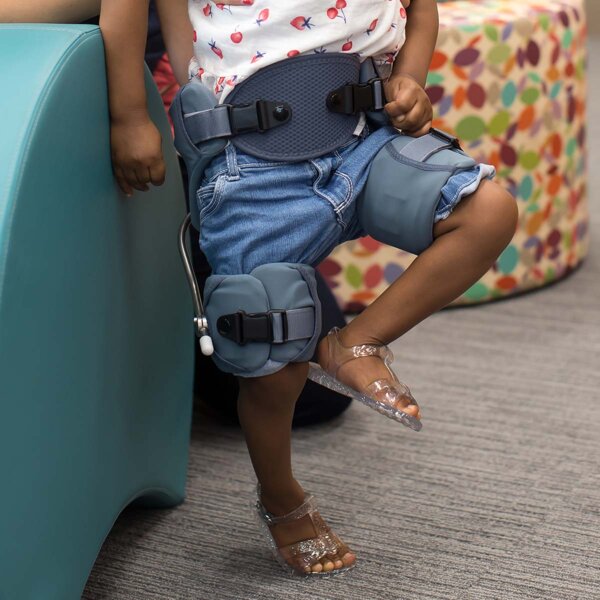 An excessive hip adduction in case of elevated tone or spasticity in e.g. CP (Cerebral Palsy), sometimes causes the child to have a shaky gait and an unstable sitting. The SWASH (Sitting-Walking and Standing Hip) orthosis helps to increase abduction and when standing and walking. What makes SWASH® unique to other hip orthoses is that it offers controlled variable abduction. It is engineered with a complex series of angles to maintain good hip alignment as the uprights follow the pathways of motion of the femurs.